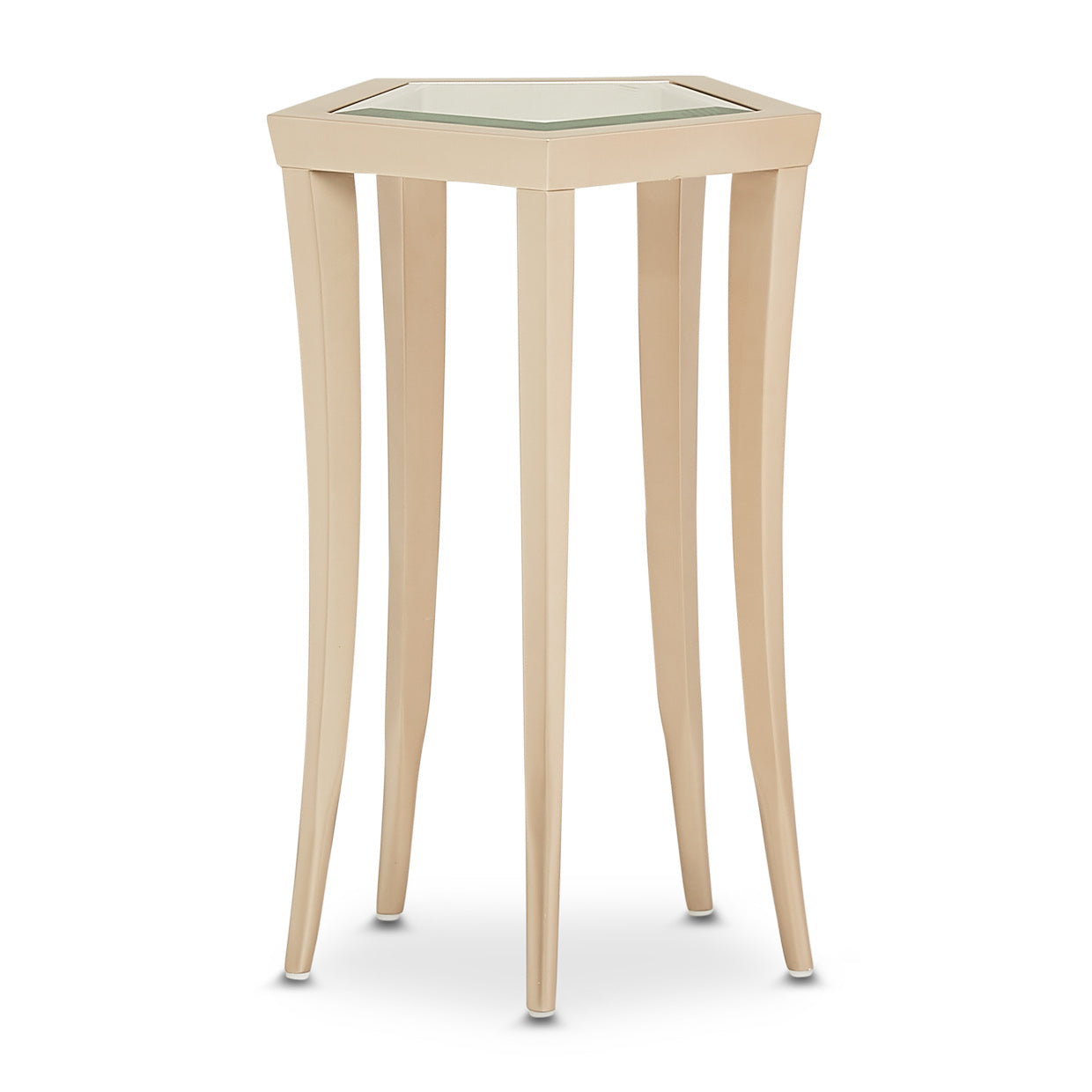 No se asuste de una declaración audaz. La mesa auxiliar La Rachelle tiene todos los ángulos, bordes limpios y calidez. Con una tapa de cristal biselado y patas largas y elegantes, esta mesa es la compañera perfecta para tu salón.