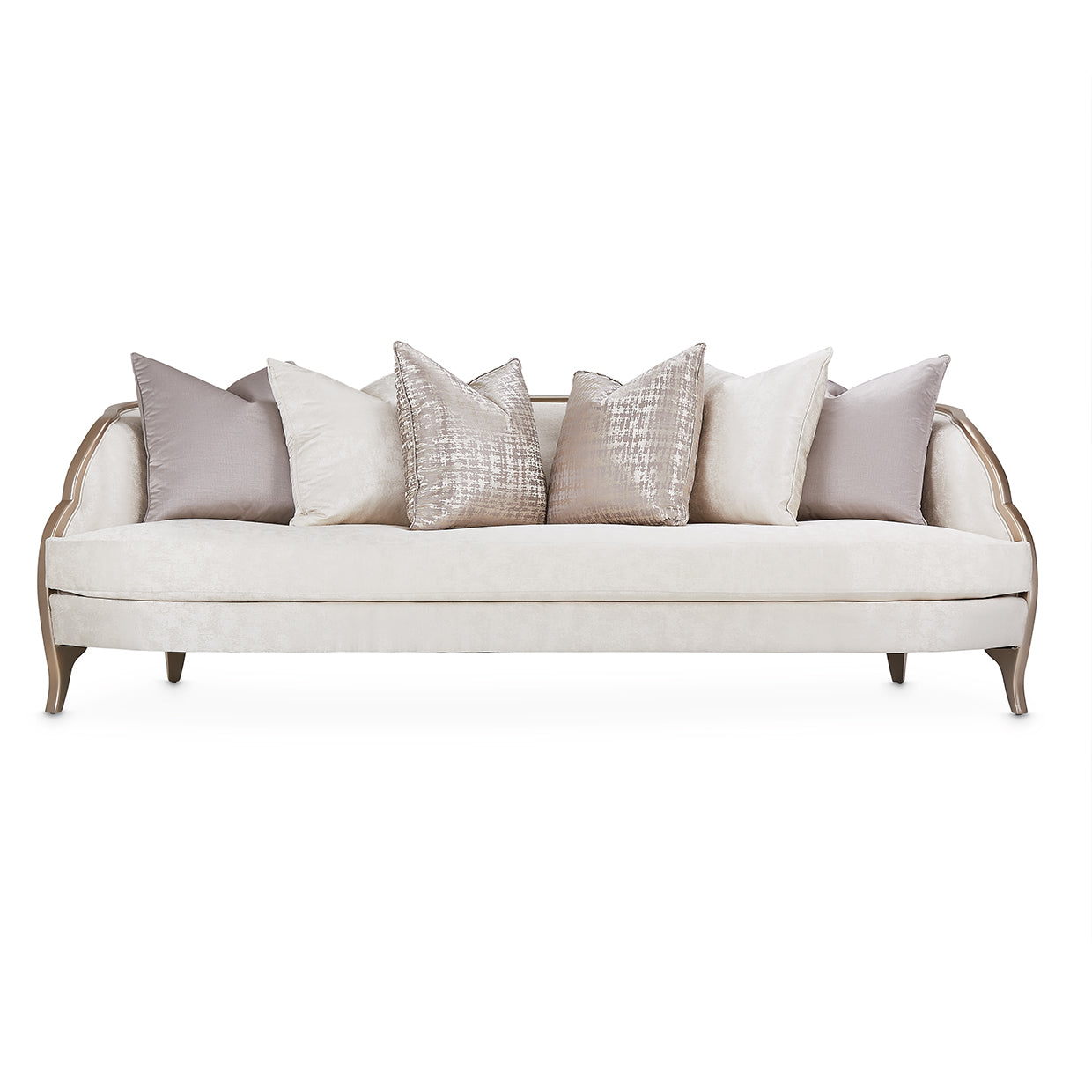 Diseñe su hogar para el romance. El Malibu Crest Sofa cuenta con un cuerpo exquisitamente curvo, brazos con muesca en V acabados en Chardonnay y un asiento de textura suave que seguramente iluminará la atmósfera de su hogar al instante.